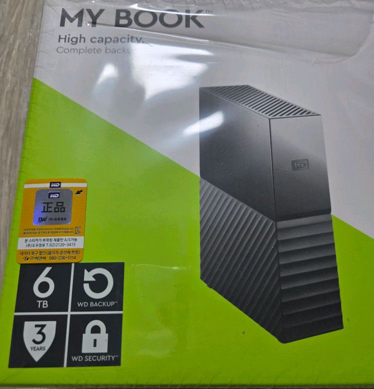 Western Digital WD My Book 6TB CMR 국내 도우정보 정발 외장 하드 풀박스입니다. 구입 날짜가 기억나지 않는데, 제조일자는 조회해보니 21년 7월 21일입니다. 가정에서 단순 저장용으로 가끔 사용하던 거라서 두 번째 사진처럼 사용량도 메우 적고, 상태 최상입니다. 포맷 완료, 보관중입니다.