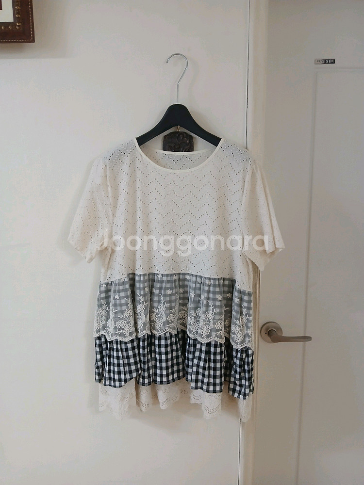 새제품 레이스 펀칭 체크 블라우스 임부복 가능 가슴단면 52정도