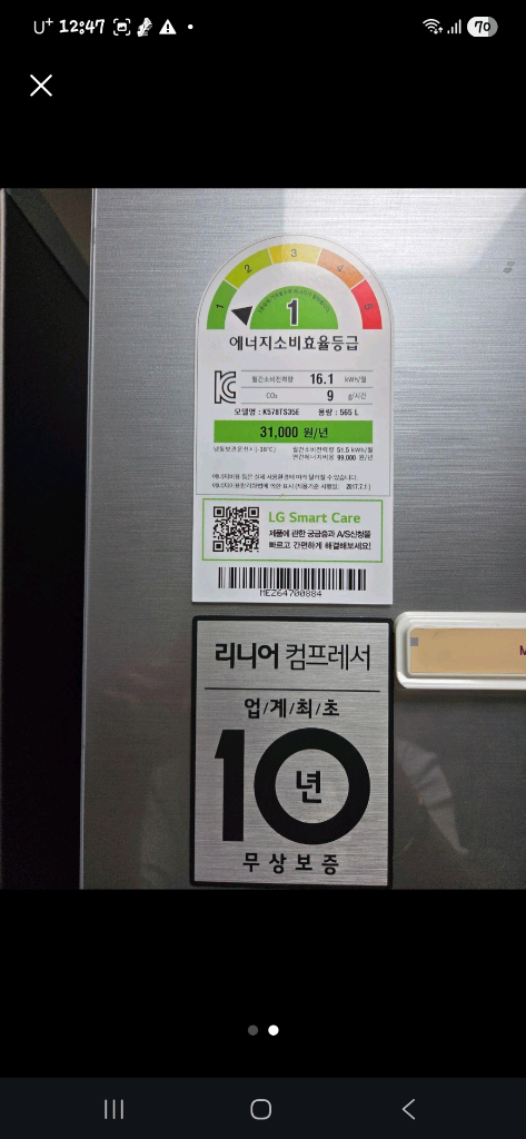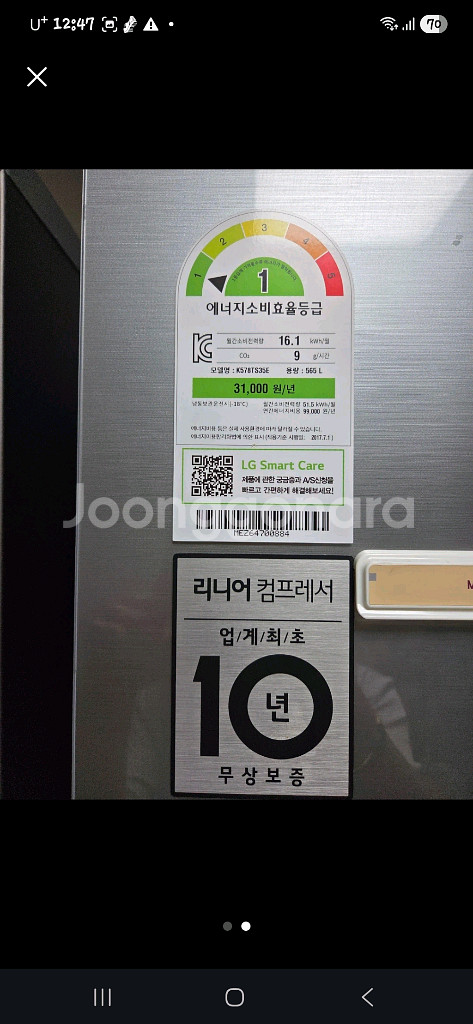개인정보(거래정보)를 주고받는 행위는 사기에 노출될 수 있으므로 즉시 중고나라로 신고해 주세요LG 디오스 냉장고 K578TS35E 모델입니다 - 에너지 소비 효율 1등급 제품이에요 - 용량은 565L입니다 - 리니어 컴프레서 10년 무상보증 스티커가 붙어있습니다
