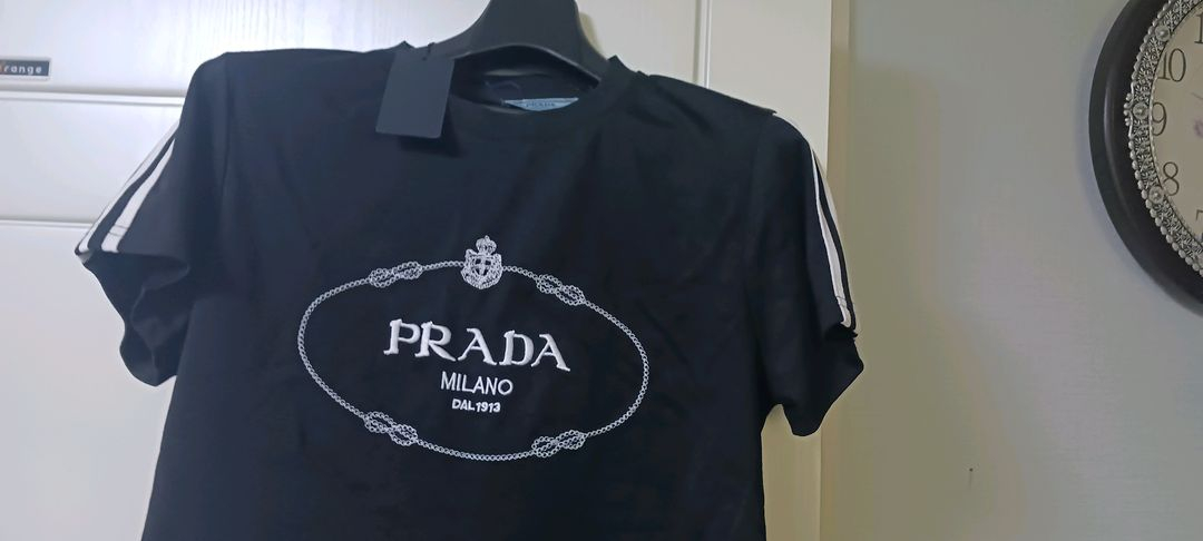 프 라 다 반팔티와 데님 반바지 세트예요. 태그가 달려있는 새 상품이고 상태 정말 좋습니다. 고급스러운 로고 디자인이 포인트네요!