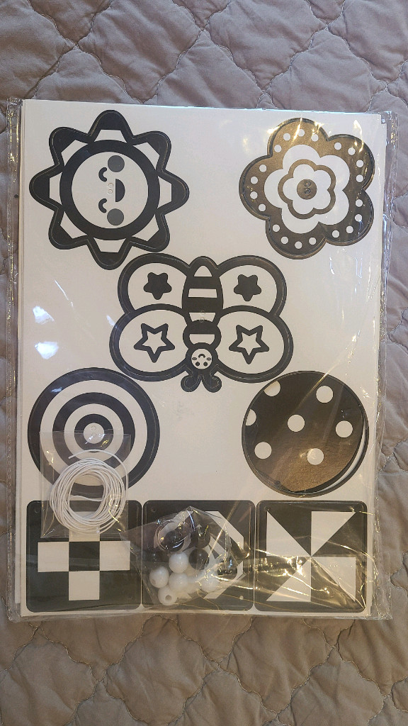 흑백 모빌 만들기 세트입니다 아기 시각 발달에 도움을 줍니다 생후 1개월 무렵부터 20~25cm 정도 거리를 두고 보여주면 좋습니다 구성품은 다음과 같습니다