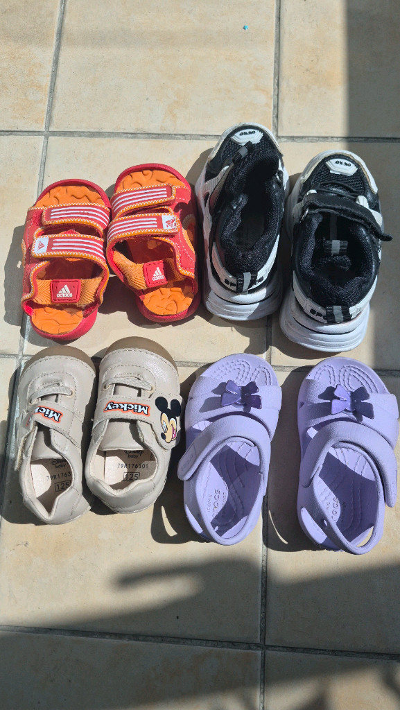 다양한 브랜드의 아동용 신발 4켤레 일괄 판매해요. 샌들, 운동화, 슬리퍼 등 여러 종류가 포함되어 있고 전체적으로 사용감은 있지만 아직 착용 가능한 상태입니다.