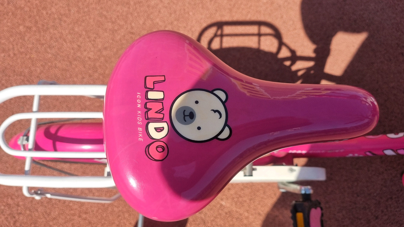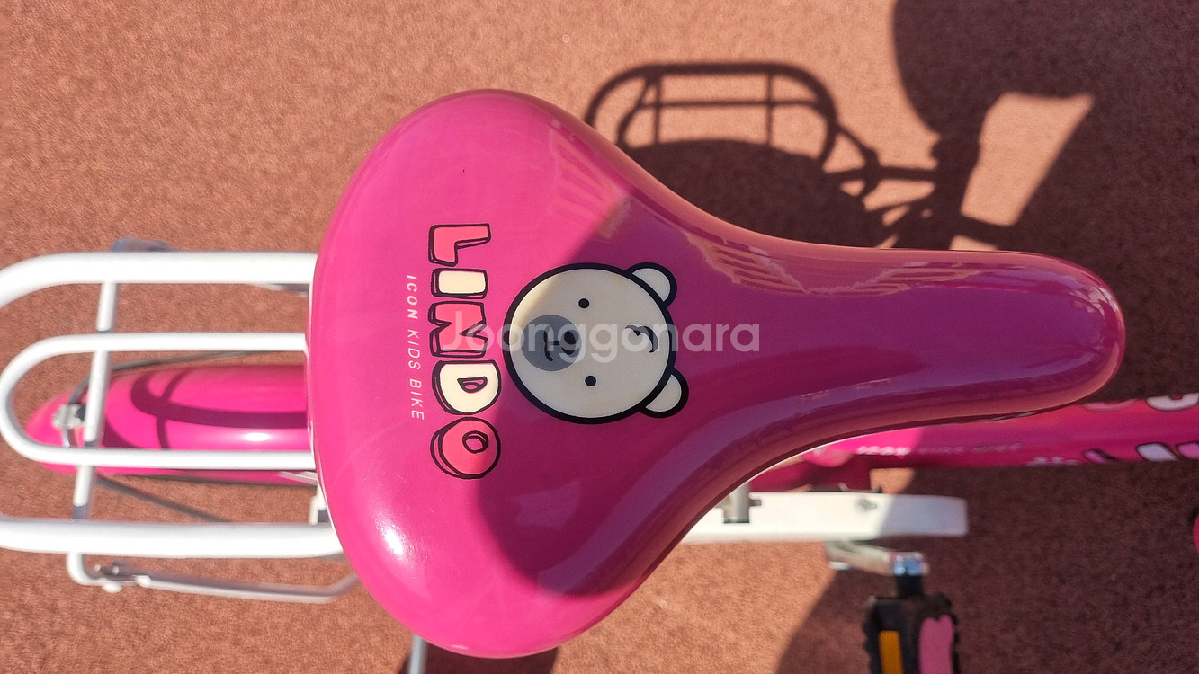 귀여운 곰돌이 디자인이 있는 핑크색 아동용 자전거예요. 앞바구니와 보조바퀴가 포함되어 있어서 아이들이 타기 좋을 것 같아요. 전체적으로 깨끗한 상태로 보입니다.