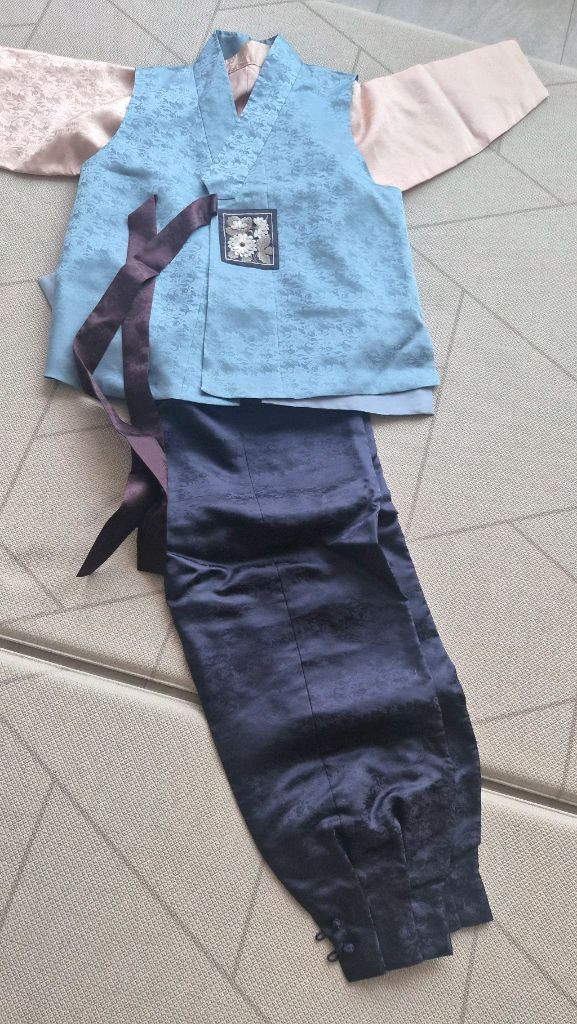 1. 구성 : 하늘색 조끼와 분홍색 저고리, 남색 바지 2. 착용횟수 : 스냅 촬영시 1회, 결혼식 1회 착용 3. 사이즈 : 키173, 몸무게81에 맞춤 사이즈 (두번째 스냅촬영시 실착사진입니다.) 4. 구 입 : 새미한복 3. 특이사항 : 저고리 한복 저고리 동정(흰깃)은 얼룩져서 제거해둔 상태. 동정 부착에 따른 접착제 얼룩 자국은 있음(사진 참고). 동정만 따로 구입해서 부착해 입으면 전혀 표시없는 부분입니다.