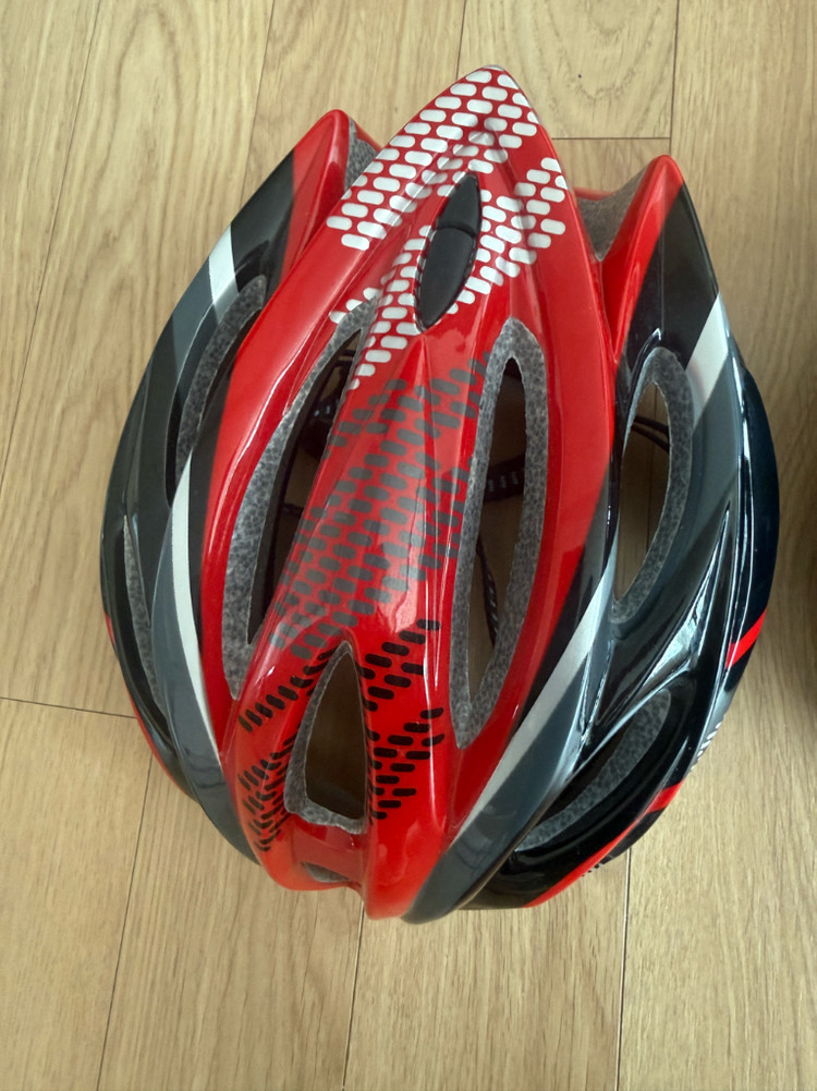 자전거 헬멧이에요. 레드와 블랙 컬러 조합이 멋스럽고 통풍구도 잘 되어있어서 실용적이에요. 착용 거의 하지않아 상태 양호합니다.