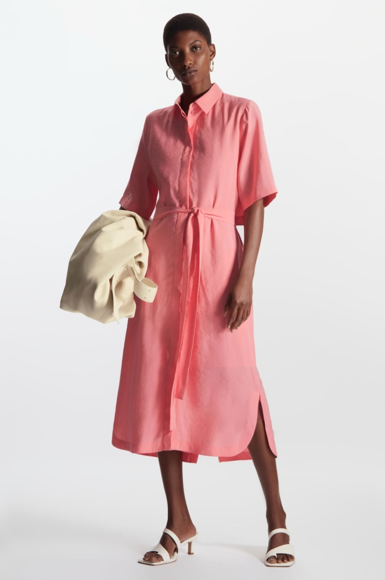 가슴 46 기장 116 코스 벨티드 셔츠형 미디 원피스 32사이즈입니다. 산뜻한 코랄 색상에 허리 벨트가 포인트인 제품입니다. 새상품 컨디션 깨끗한상태입니다 :)