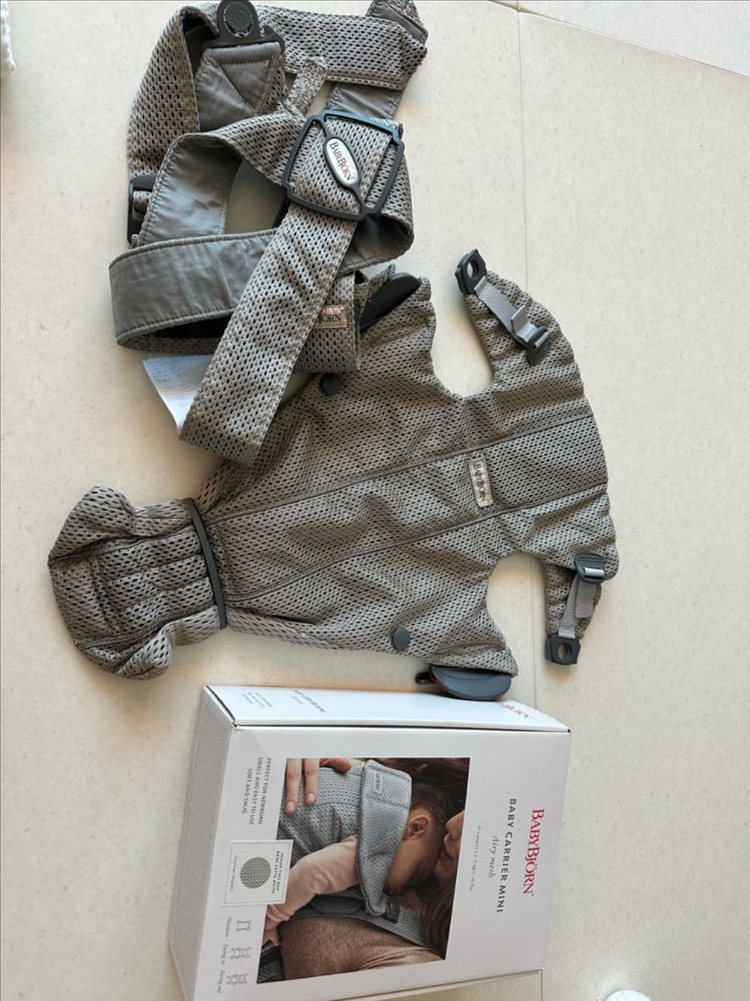 메쉬 소재 아기띠입니다. 통기성이 좋고 상태 양호해요. 박스도 함께 드려요!
