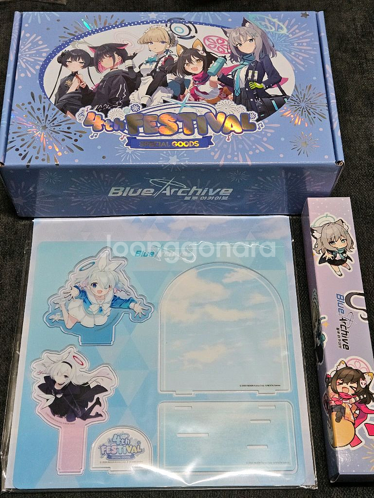 블루아카이브 4주년 온리전에서 구매한 공식 굿즈입니다. 4주년 기념 패키지 + 아로나&프라나 LD 디오라마 + 4주년 응원봉 총 3개입니다. 4주년 기념 패키지 내용물 빠짐없이 전부 포함, LD 디오라마 미개봉, 응원봉은 행사 당일에 사용 후 정리했으며 작동에 이상 없습니다. 이사 준비중이라 전시 안하고 보관만한 굿즈들 처분합니다. 제가 판매중인 다른 굿즈들과 함께 구매시 에누리 가능합니다.