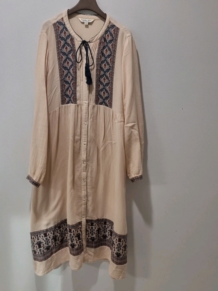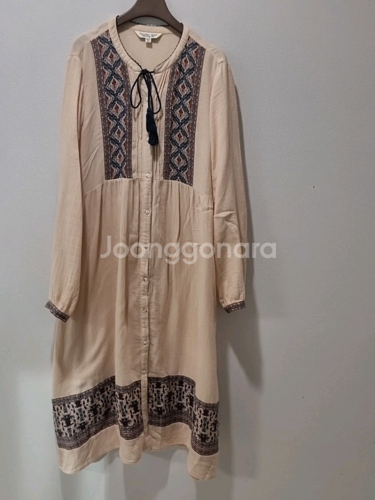 써스데이아일랜드 특유의 빈티지 감성 예쁜 에스닉 자수 디테일 롱원피스입니다 🤍 넥라인 태슬 끈 디테일 + 앞버튼 오픈형이라 단독으로도, 가벼운 아우터처럼도 활용 가능해요. 차분한 베이지톤에 가슴라인 & 밑단 에스닉 패턴 포인트 들어가서 여행룩, 데일리룩 다 잘 어울립니다 :) 뒷라인 스트링으로 핏 조절 가능해요. ✔ 사이즈 : 85(S) ✔ 가슴단면 : 48 ✔ 총장 : 113 55-66반가능해요. ✔ 상태 : 전반적으로 깨끗, 자연스러운 생활주름 정도 ✔ 면 소재로 착용감 편하고 가벼워요