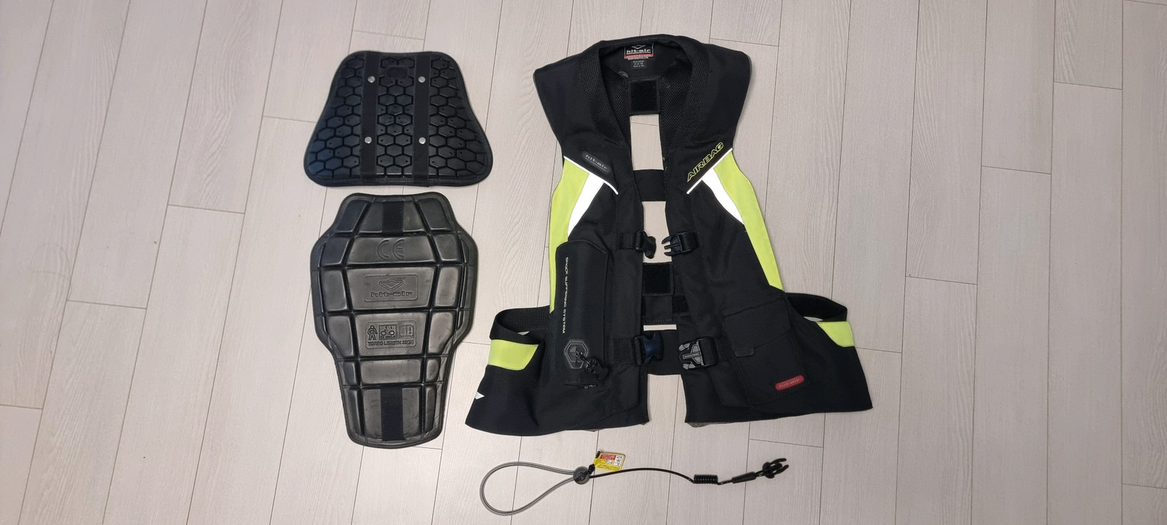 히트에어 에어백 조끼입니다 L~2XL까지 조절가능합니다 척추보호대랑 가슴보호대 추가 옵션 있습니다 사용감 거의없습니다 찍찍이때문에 보풀살짝 일어난게 전부입니다 사진으로 확인해주세요