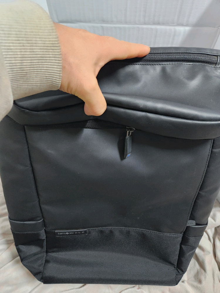 노트북 수납 가능한 실용적인 백팩이에요. 사용감은 있지만 기능적으로 문제없고 노트북과 필수품 넣기 좋습니다. 깔끔한 블랙 컬러로 어디든 잘 어울려요.샘소나이트 백팩 입니다