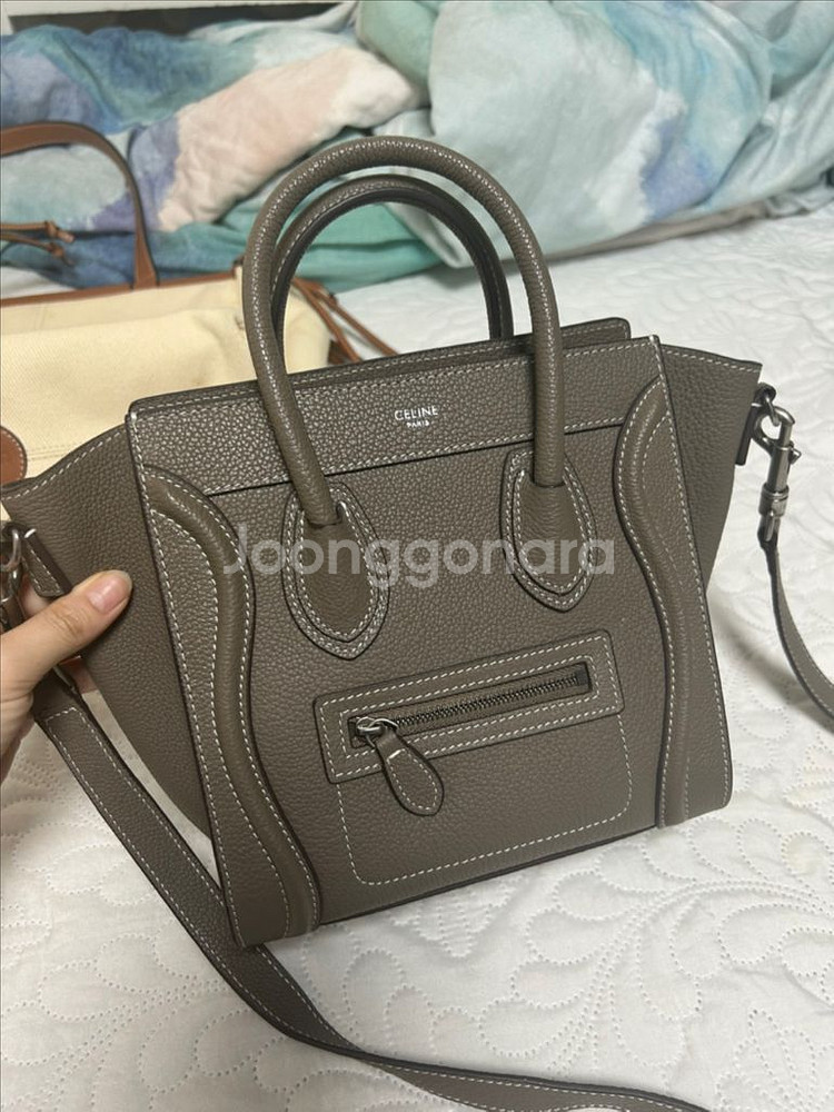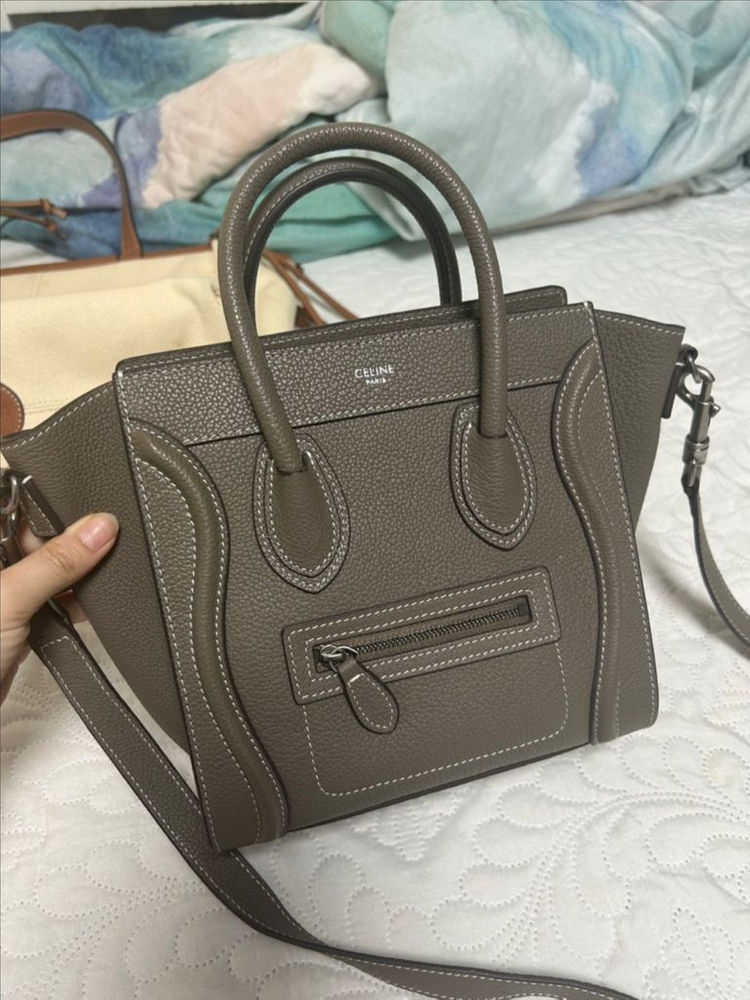 셀린느 나노 러기지 나노사이즈 에토프 색상이예요! 구매당시 40만원대로 구매해서 퀄리티 최상입니다! 얼마 안들고 5번정도 들고나감 보관하다 살짝 가죽 스크레치 확인해주세요! 여분 가죽도 넣어드립니다! 박스가 커서 택배비는 5500원입니다!