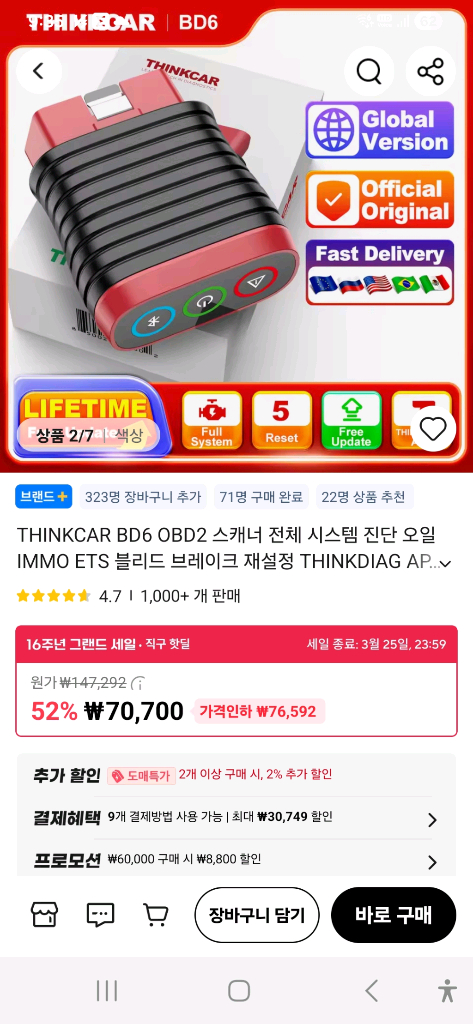 🚗 차량 점검, 이제 집에서도 전문가처럼! THINKCAR BD6 OBD2 스캐너 (미사용 새제품) 판매합니다. ✔️ 풀 시스템 진단 지원 엔진, 미션, ABS, 에어백 등 차량 전체 시스템을 한 번에 체크! ✔️ 오류 코드 확인 & 삭제 가능 정비소 가기 전에 미리 확인하고 불필요한 비용 절약하세요. ✔️ 완전 새제품 박스, 설명서 모두 포함 / 미사용 상태 그대로입니다. ✔️ 간편한 앱 연동 동봉된 시리얼 번호로 앱 연결만 하면 바로 사용 가능! --- 💡 이런 분께 추천드립니다 - 정비소 가기 전 미리 상태 확인하고 싶은 분 - 차량 관리 직접 해보고 싶은 분 - 중고차 구매 전 점검용 필요하신 분 👉 지금 바로 가져가시면 차량 관리 비용, 시간 모두 아낄 수 있습니다. 👉 새제품 상태라 선물용으로도 좋습니다! 필요하신 분 편하게 연락 주세요 🙂