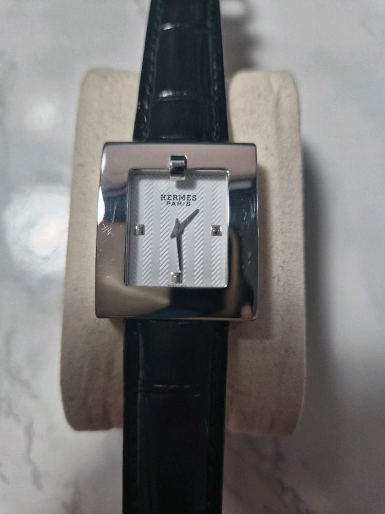 에르메스 HERMÈS H 아워 BE1.210 스몰 쿼츠 에르메스를 상징하는 H 케이스 디자인 케이스 폴리싱 완료 버클 폴리싱 완료 전체적으로 깔끔한 컨디션입니다. 현재 새 컨디션 가죽 스트랩 장착 남녀공용 착용 가능 사이즈 심플하지만 한눈에 브랜드가 보이는 시그니처 모델입니다. 화이트 헤링본 패턴 다이얼에 입체 인덱스 세팅으로 고급스럽고 깔끔한 인상. 남녀공용으로 착용 가능하며 슬림한 손목에는 세련된 포인트, 여성 착용 시 클래식한 데일리 워치로 좋습니다. 현재 블랙 가죽 스트랩 장착. 기존스트랩 투칼라 1세트 (브라운, 블루) 기분에 따라 교체 가능. 정상 작동. 가품일 시 200% 보상. 모델 : BE1.210 무브먼트 : 쿼츠 케이스 : 스테인리스 스틸 사이즈 : 약 30 x 21mm (용두 제외 추정) 연락 주세요. 에르메스는 결국 H아워가 정석입니다.