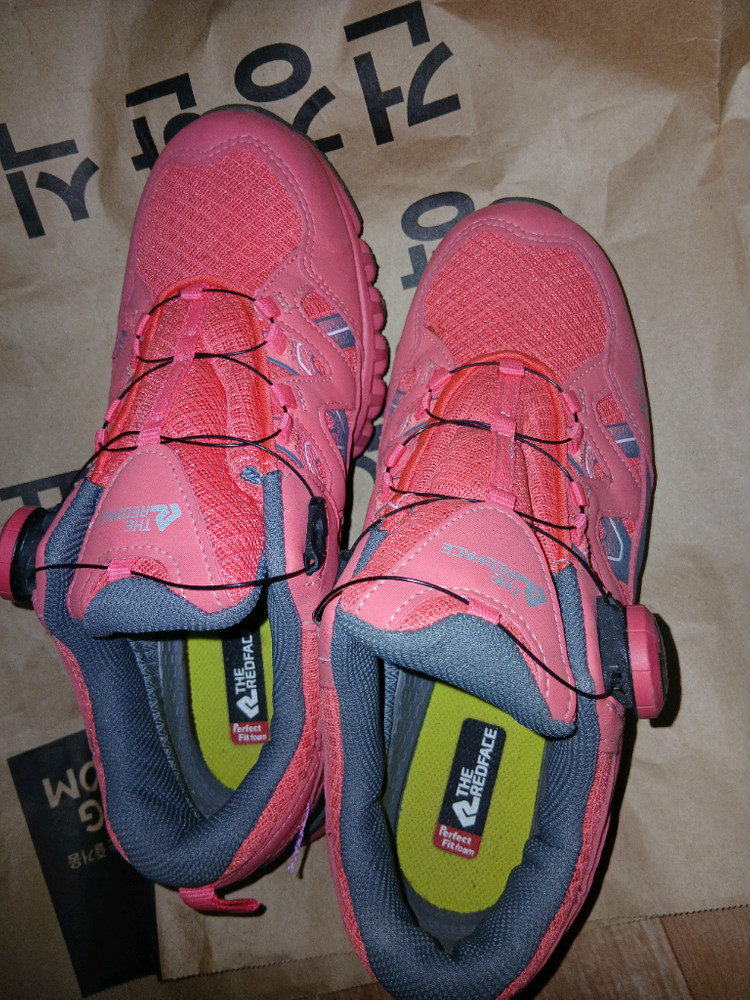 여성용 트레일 러닝화예요. 핑크와 그레이 컬러 조합이 예쁘고 밑창 상태도 양호해 보입니다. 트레일 러닝이나 일상 운동화로 활용하기 좋을 것 같아요.(직거래 됩니다)