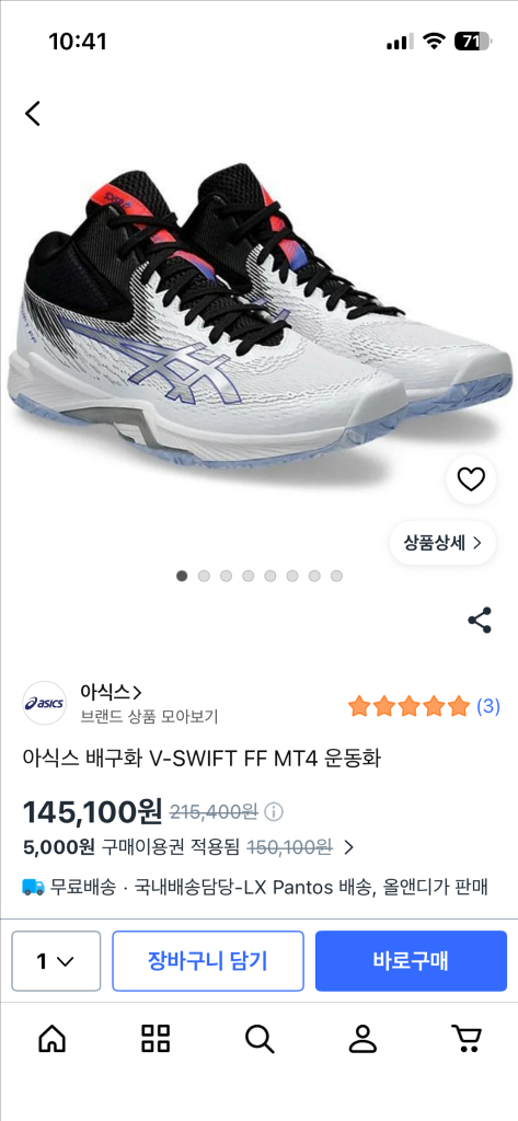 개인정보(거래정보)를 주고받는 행위는 사기에 노출될 수 있으므로 즉시 중고나라로 신고해 주세요아식스 배구화 V-SWIFT FF MT4 상품이고 구매한지는 1달 실착용은 5회입니다. 접지력좋고 방향전환에 용이합니다. 쿠션은 적은편이라 취향에 맞지않아 판매합니다. 택배비 4천원입니다.