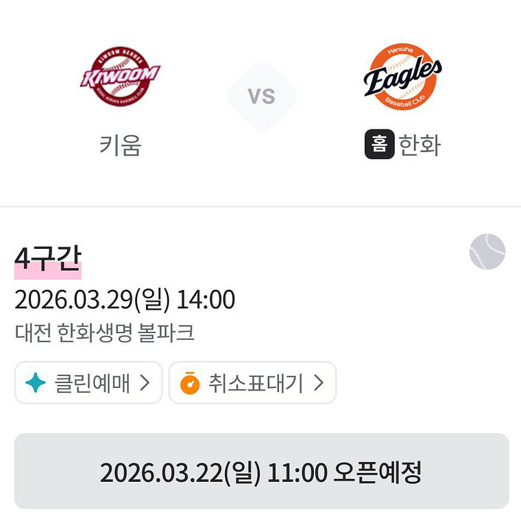 키움 vs 한화 29일 티켓 양도 한화생명볼파크 3/29 개막시리즈 1루 응원단석 107구역 3열 4연석 (통로) 5만(장당) 1루 내야지정석A 207구역 1열 4연석 (통로) 5만(장당) 중앙탁자석 100B 3열 4연석 9만(장당) 단석/2연석 모두 가능합니다! 연락주세용
