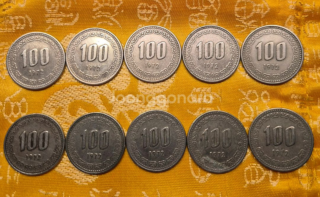 1972년에 발행된 100원 동전입니다. 10개 일괄 판매하며, 상태는 사진과 같습니다. 수집용으로 소장 가치 있습니다. 문의 없으시면 바로 안전결제해주시면 됩니다!