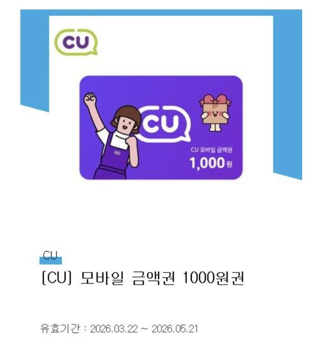 CU 편의점에서 사용 가능한 1000원 모바일 상품권이에요. 유효기간이 있으니 확인하시고 구매해주세요!
