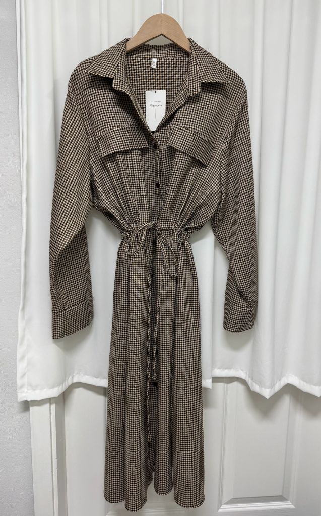 인터넷쇼핑몰 어거스트플랜에서 구입했던 체크 롱 원피스입니다. 택달린 새상품이구요! 하운드투스 체크 패턴이 고급스럽고 허리 스트랩으로 라인을 잡아줄 수 있습니다. 롱기장이라서 편하게 입기 좋습니다^^ ✔️표기사이즈 XL 실측가단60 총장113정도 확인됩니다 🥰