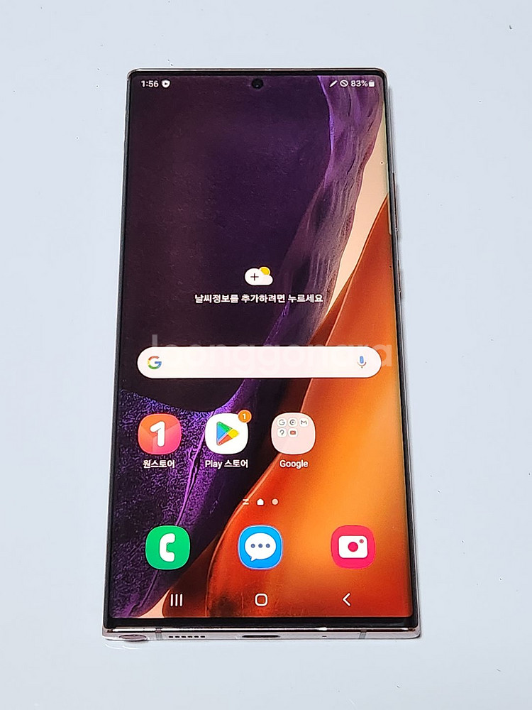 갤럭시노트20울트라 256G 무잔상 58957 1. 외관 - 액정 : 기스 조금 있습니다 / 화면 오른쪽 검은점 있습니다. - 외관 : 뒷판 깔끔 / 테두리 흠집 조금 있습니다. 2. 상품설명 - 색상 : 브론즈 - 최초통신사 : KT (아무 통신사나 유심 옮겨 사용 가능합니다) - 구성품 : 기기단품 3. 기타 - 25% 선택약정 할인 적용 가능한 제품입니다 - 직거래 서울 교대역 가능합니다 - 택배 4시 50분까지 당일발송 가능합니다 - 상품번호 : 58957