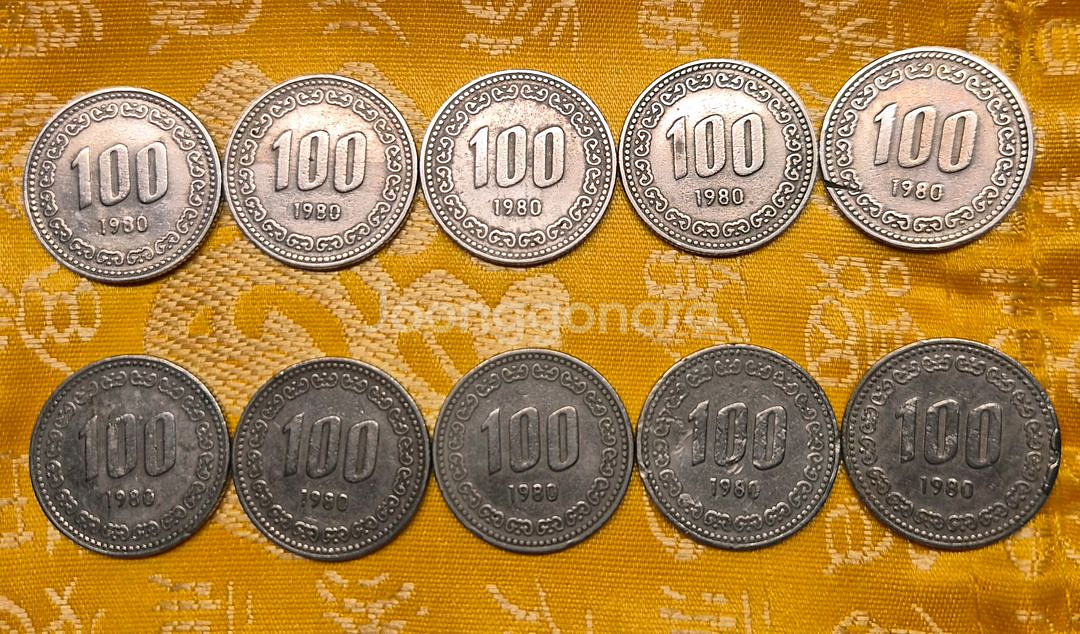 1980년에 발행된 100원 동전 10개 세트입니다. 오래된 동전인 만큼 약간의 사용감은 존재합니다. 희소성 있는 연도이므로 소장 가치 있습니다. 별도 문의 없으시면 바로 안전결제 부탁드려요!