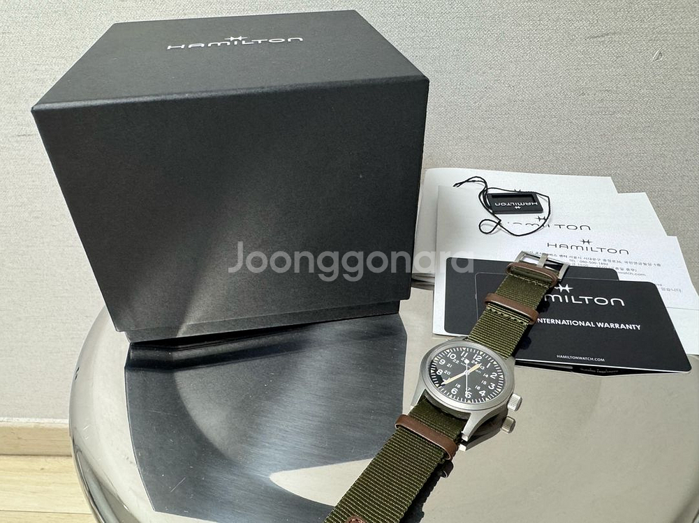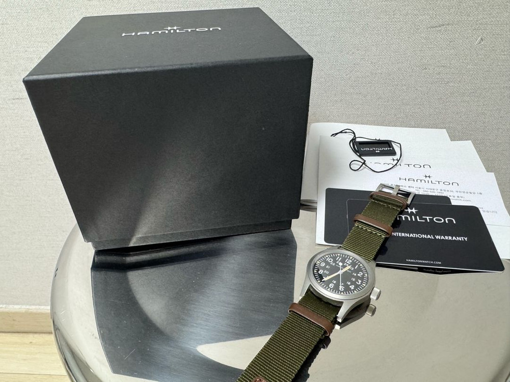새상품급 해밀턴 카키필드 매카니컬 38mm 모델 판매합니다. 주요 특징 및 상태: • 모델명: H69439931 (정품) • 무브먼트: H-50 수동 (풀 와인딩 시 80시간 파워리저브로 주말에 안 차도 멈추지 않아 매우 편합니다!) • 글라스: 사파이어 크리스탈 (스크래치 없음) • 상태: 사용감이 거의 느껴지지 않는 민트급 컨디션입니다. 케이스, 글라스, 특히 나토 밴드는 새상품입니다. • 구성품: 해밀턴 정품 박스, 보증서(스탬핑 완료), 설명서, 택 등 풀박스 구성 필요하신 분 연락주세요.