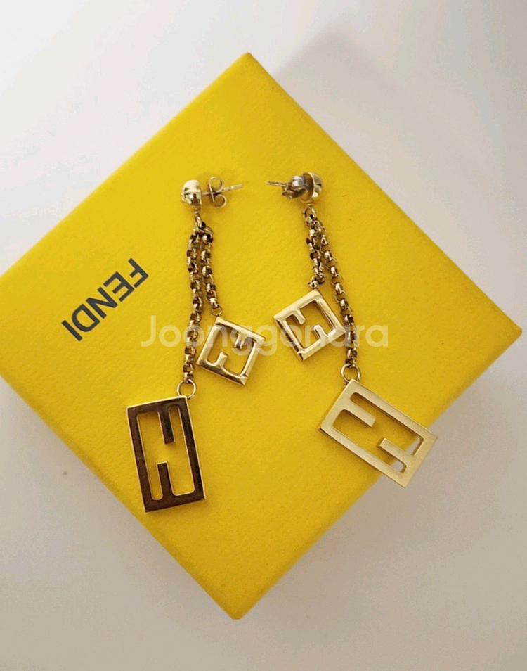 ♡펜디 FF로고 체인 드롭귀걸이♡ - 두개의 FF 로고 사각형 펜던트가 체인에 연결 된 드롭 스타일 귀걸이 입니다 1. 총길이 대략 7.5cm 2. 색상 : 골드 3. 구성품: 본상품. 박스 4. 정품인증 원형 부분에 FF 로고 각인, 사각 펜던트에 mede in Italy 각인 있습니다 5. 제품상태 - 귀침 케치 한쪽 분실로 다른걸로 교체 - 사각형 펜던트,체인 부분 일반적인 사용에 따른 흔적 있습니다 6. 중고제품 특성상 교환 반품 환불불가 입니다