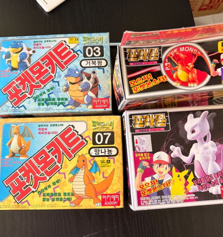 잘 보관해둔 고전프라모델 아카데미 프라몬 포켓몬 새상품들 판매 합니다 리자몽빼고 박스상태 양호합니다 리자몽 박스 상단부분 살짝 들어감 사진참고 택배비 3천원 프라몬 프테라-판완 갸라도스 판완 망나뇽 판완 리자몽 9만 뮤츠 7만원 포켓몬키트 탕구리-판완 거북왕 5만 망나뇽 5만원