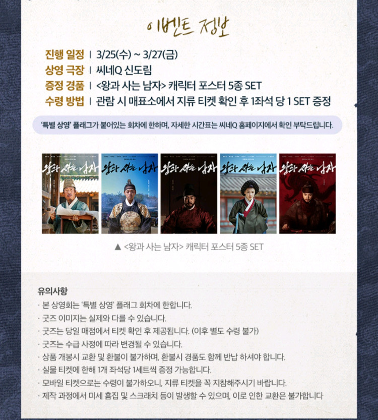 개인정보(거래정보)를 주고받는 행위는 사기에 노출될 수 있으므로 즉시 중고나라로 신고해 주세요씨네큐 왕과사는남자 5종 포스터 미개봉 금요일 수령 당일 or 토요일 배송 결제 후 취소 불가능한 상품입니다.