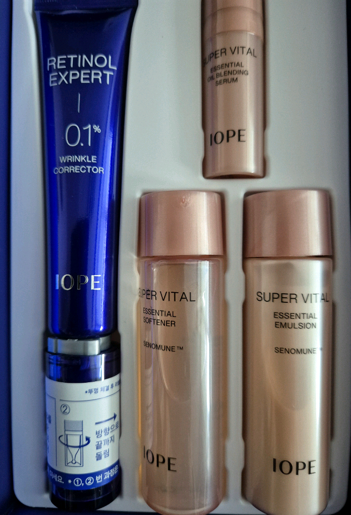 아이오페 레티놀 엑스퍼트 0.1% 링클 코렉터 30ml와 슈퍼바이탈 에센셜 소프너 32ml, 에센셜 에멀젼 32ml, 블렌딩 세럼 5ml로 구성된 세트입니다