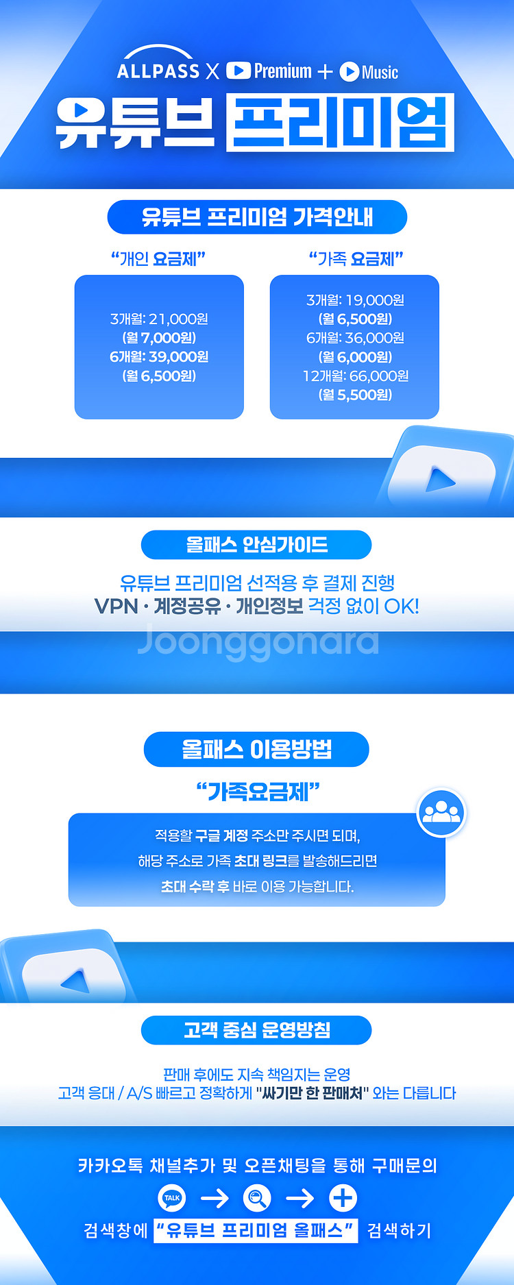 유튜브 프리미엄+뮤직 판매 후에도 계속 책임지는 운영! 고객 응대, A/S 빠르고 정확하게 “저렴하기만 한” 판매처와는 다릅니다 구매 문의는 게시된 이미지 '하단' 참고 부탁드립니다! 깨톡: 유튜브 프리미엄 올패스 <-- 검색하셔도 ㅋrㅋr오 채널 나옵니다.! 후기도 많으니 꼭 들려서 고민되시면 후기 보고 판단하세요! 가족요금제 3개월: 19,500원 6개월: 36,000원 12개월: 66,000원 개인요금제 3개월: 21,000원 6개월: 39,000원