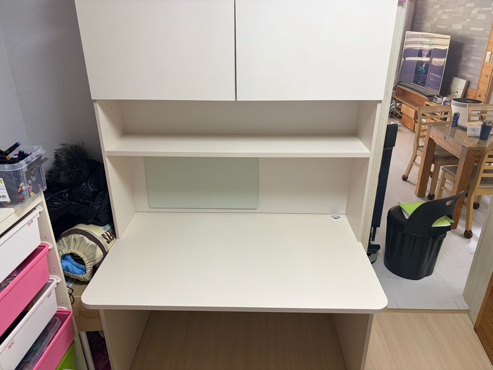 리바트 아이보리 색상의 책상 세트입니다 수납공간이 넉넉해서 물건 정리하기에 용이합니다 깔끔한 디자인으로 어느 인테리어에도 잘 어울립니다 상태는 깨끗합니다 실사용 6개월. 엘베없는 4층으로 4월4일 이삿날 내려드릴수는 있어요 의자는 없구요 사진처럼 레진?이 뭍었는데 안띠어지네요 그래서 가격 싸게팝니다 직거래 수원 율전동 입니다