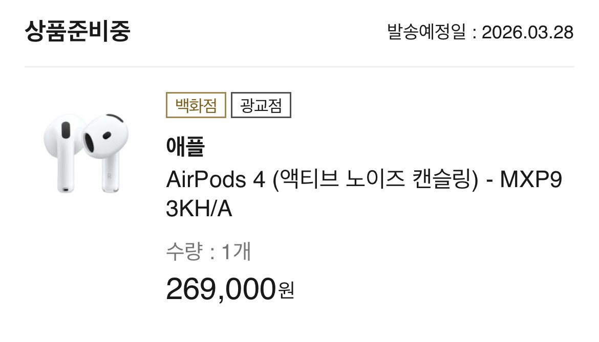 개인정보(거래정보)를 주고받는 행위는 사기에 노출될 수 있으므로 즉시 중고나라로 신고해 주세요 AirPods 4 (액티브 노이즈 캔슬링) - MXP93KH/A 입니다. 주소지로 바로 보내드려요!