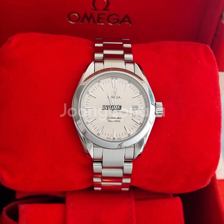 이번에 소개시켜 드릴 시계는 오메가 드레스워치 아쿠아테라 쿼츠 라인으로 깔끔하고 정교한 디자인 덕분에 오랫동안 사랑받는 스테디셀러입니다. 2002년 출시해서 2009년 단종 된 구구구형 모델이지만 은은한 광택이 도는 실버 컬러 다이얼은 유행을 타지 않는 세련미를 보여줍니다. 아쿠아테라 특유의 날카로운 삼각형 인덱스가 적용되어 시인성이 뛰어나며 입체감이 느껴집니다. 3시 방향에 날짜창이 있어 실용적입니다. 내구성과 방수 '아쿠아테라'라는 이름 답게 150m 방수를 지원하여, 일상적인 세안이나 수영 시에도 안전하게 착용 할 수 있습니다. 여성분들에게 가장 선호되는 29mm 사이즈로, 너무 작지도 크지도 않은 적당한 존재감을 줍니다. 그리고 쿼츠 무브먼트를 탑재하고 있습니다. 기계식 시계처럼 태엽을 감아줄 필요가 없어 관리가 매우 편하며, 시간 오차가 거의 없다는 것이 큰 장점입니다. 2026년 3월 21일에 소프트 폴리싱과 내부 점검 및 배터리(서비스 센터와 동일) 교체해서 미세 기스도 찾아보기 힘들 정도로 깨끗하고 배터리도 최소 2년은 교체할 필요 없습니다 고민하는 순간 팔리고 없으니 빠른 초이스 해주세요. 모델번호 - 2577.30 사이즈 - 29mm 리테일가 - 215만원 상태 - 새제품 대비 96% 구입시기 - 2003년 구입한곳 - 국내 DF 구성품 - 박스,보증서,책자,여분링크 줄 길이 - 17cm(한칸 없음) 무브 - 쿼츠 ## 2021년부터 현재까지 중고나라에서 셀러회원으로 활동 중인 JN TIME입니다. (네이버에 상호 검색하면 위치와 번호 나옴) 매장으로 오시면 매입된 제품은 카드결제나 현금영수증 가능합니다. (일부 위탁판매 제품은 제외) 단 택배는 선입금 택배거래만 가능합니다. (안전결제 불가!!) 그리고 판매 금액이 감정이나,수리,상품화 같은 비용이 포함되었어도 개인 간 판매되는 금액 수준이라 에누리는 어렵습니다. 교환이나 에누리 문의 주시면 따로 답장하지 않겠습니다. 제품 구입 관련 문의만 부탁드립니다.