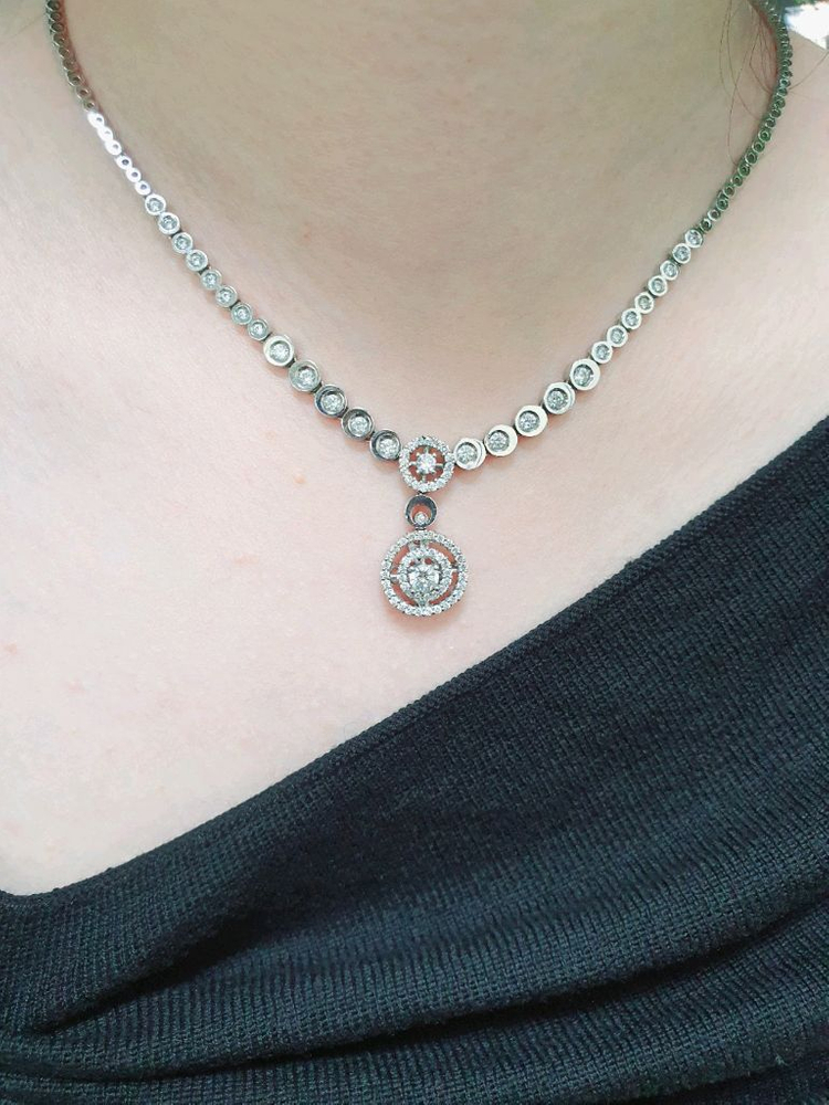 14k 화이트골드 소재의 고급스럽고 화려하면서 우아한 목걸이와 팔찌 세트예요. 중앙에 큰 원형 다이아가 포인트로 들어가있고 작은원형으로디자인되어 멋진제품입니다. 몇번착용을하지않아 상태도 새것처럼깨끗하고 예물이나 프로포즈용으로 정말 제격인 제품입니다.10년전 예물로 받았는데 그때가격도 이가격정도 한걸로 기억합니다.예물이나 프로포즈를 고급스럽게 하고싶은분이면 딱좋은 제품입니다.