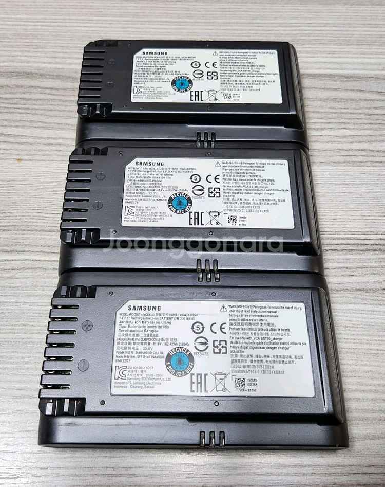 삼성전자 제트 무선청소기 용 VCA-SBT90 정품 방전배터리 입니다. (정격전압 : 21.9V) 최근까지 사용했던 배터리 이구요. 외관 깨끗한 편입니다. 3개 일괄판매 가격입니다. 솜씨 좋은 분들 리필용, 혹은 거치용으로 사용 가능할 것 같습니다. 중고라서 물건에 큰 하자 없으면 교환 환불 불가합니다. 중고나라 카페에서 보신 분들은 댓글 달아 주시면 쪽지로 연락처 보내 드립니다. (쪽지수신 설정 상태 확인해 주세요) 중고나라 앱에서 보신 분들은 바로 톡 주시면 됩니다.