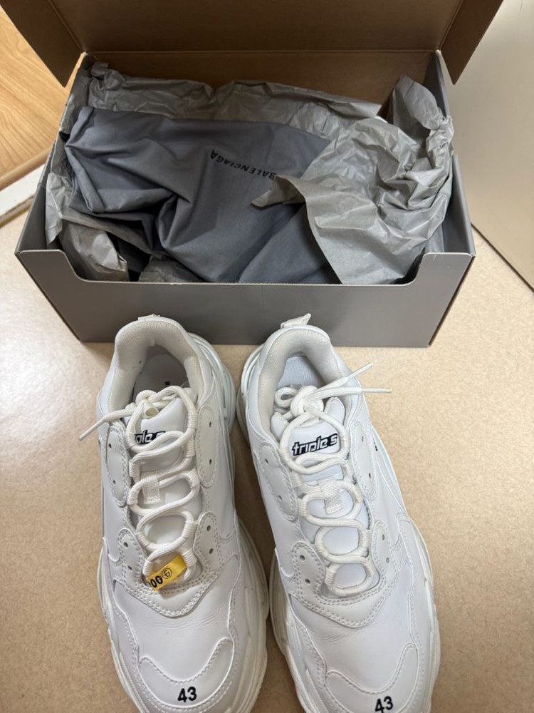 발렌시아가 트리플 S 스니커즈 화이트 색상 43사이즈입니다 청키한 디자인이 특징이며, 편안한 착용감을 제공합니다 박스, 쇼핑백 포함이며, 사진에서 보시는 것처럼 전체적으로 깨끗하고 사용감이 적은 편입니다 7회 미만착용 드라이완료후 보관중 앞에 살짝오염있습니다 - 독특한 레이어드 디자인 - 발렌시아가 로고 디테일