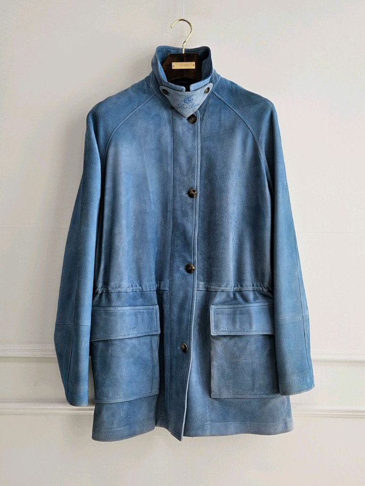로로피아나 스웨이드 홀시 자켓입니다. 로로피아나 특유의 고급 램스킨 스웨이드를 사용한 모델로, 표면 결이 아주 곱고 부드러우면서도 색감에 깊이가 살아있는 제품입니다. 일반 스웨이드보다 결이 훨씬 촘촘하고 유연해서 실제로 보면 은은하게 그라데이션 색감이 특징입니다. 컬러는 밝은 스카이블루 계열로, 로로피아나에서 자주 사용하는 워시드 톤 가공이 들어가 있어 단색이 아니라 자연스럽게 그라데이션처럼 색이 살아있고 고급스러운 분위기가 강합니다. 이런 톤은 데님, 화이트 팬츠, 베이지 슬랙스 같은 기본 컬러들과 매칭이 좋아서 봄가을 아우터로 활용도가 높은 스타일입니다. 내부는 전체 라이닝 처리되어 있고 지퍼 손잡이, 버튼, 마감 모두 로로피아나 각인 하드웨어로 브랜딩느낌이들어 나는 자켓입니다 외피 100% AGNELLO (램레더)로 이 급의 스웨이드 퀄리티는 로로피아나 가죽 라인 중에서도 최상급에 들어가는 소재입니다. 전체적으로 사용감 크지 않고 스웨이드 특성상 자연스러운 결 변화 정도만 있으며 눈에 띄는 오염이나 손상 없이 상태 좋은 편입니다. 46 사이즈로 여성 오버핏부터 남성 105 정도까지 남녀모두 착용 가능합니다. 어깨 50 팔기장 63 가슴단면 58 총장 80 나그랑 목선부터 팔소매 끝까지 80 클리닝 완료 문의주세요