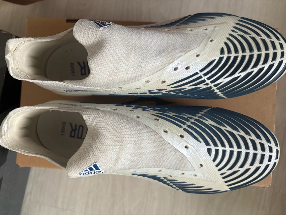 아디다스 프레데터 엣지 축구화입니다 흰색 바탕에 파란색 포인트가 들어가 있습니다 - 사용감은 있지만 기능에는 문제 없습니다 - 아디다스 프레데터 엣지는 스피드플로우 기술이 적용되어 있어 민첩성과 반응성을 향상시켜 줍니다 - 접지력이 우수하여 안정적인 플레이를 할 수 있습니다 중고거래 특성상 교환환불 어렵습니다