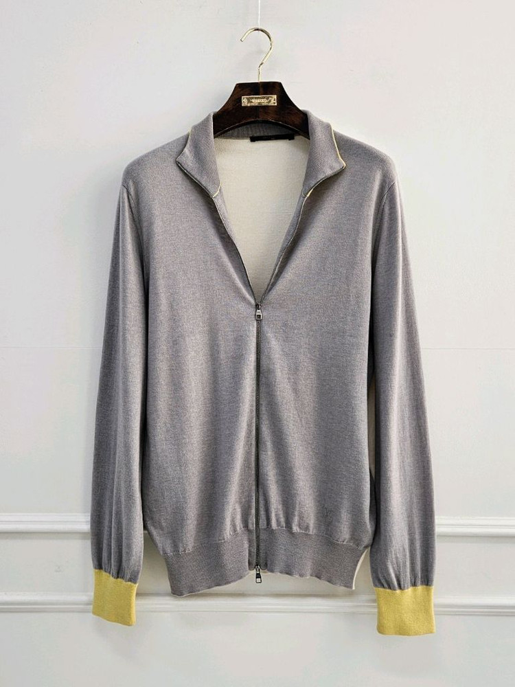 루이비통 캐시미어 하이넥 투웨이 집업 자켓입니다. 얇고 부드러운 캐시미어 베이스라 착용감이 가볍고 봄 가을 시즌 단품으로 바로 활용하기 좋은 타입입니다. 이 제품은 투웨이 집업 구조라 연출이 다양하게 나오는 게 핵심인데 지퍼를 풀어서 입으면 자연스럽게 떨어지는 가디건 느낌으로 가볍게 걸치기 좋고 끝까지 올리면 하이넥으로 올라가면서 깔끔하게 정리된 무드가 나오고 중간 정도만 올리면 카라를 살린 자켓 느낌으로도 연출이 가능합니다. 그래서 한 가지 스타일에 묶이지 않고 코디에 맞춰 분위기를 바꿔가면서 입기 좋은 구조입니다. 톤도 차분한 그레이 베이스에 포인트 컬러가 들어가 있어 단독으로 입어도 심심하지 않고 이너로 넣었을 때도 은근하게 포인트 역할을 해주는 쪽이라 레이어드 활용도도 확실합니다. 슬랙스, 치노, 데님까지 전부 자연스럽게 연결되는 스타일이라 데일리로 활용도 높은 제품입니다. 상태는 전체적으로 깔끔합니다. 소재라벨이 세탁시 지워져서 잘 안보이는데 만저보시면 캐시미어임을 확인하실수 있습니다 정말 부드럽습니다. 사이즈 L 어깨 45 가슴단면 56 팔기장 72 총장 70 문의주세요