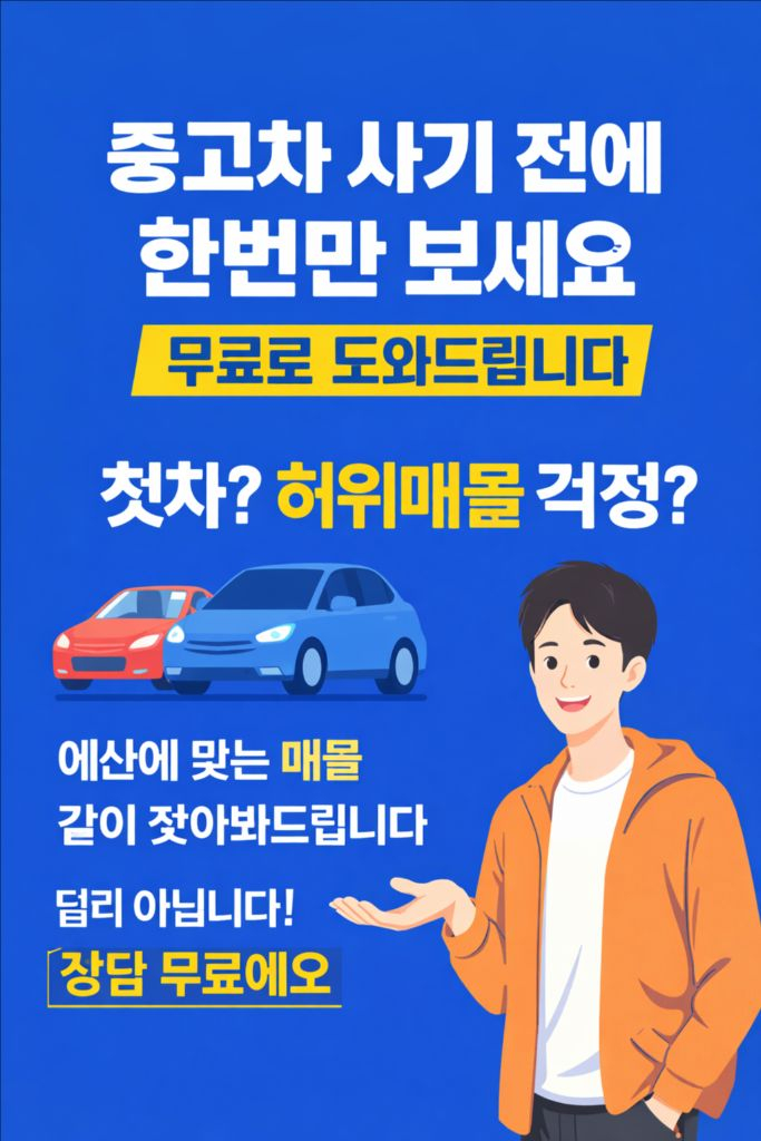 중고차 알아보시는 분들 도와드립니다 첫차 구매하시거나 딜러 말만 믿고 사기 불안하신 분들 많아서 예산에 맞춰 괜찮은 매물만 같이 봐드리고 있습니다 허위매물, 가격 눈탱이 피하게 중간에서 같이 확인해드립니다 부담 없이 편하게 문의 주세요 (상담은 무료입니다) 지금 알아보시는 분만 도와드립니다 (단순 문의 X, 구매 계획 있으신 분만)