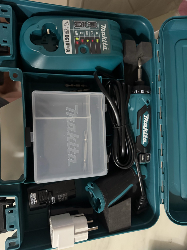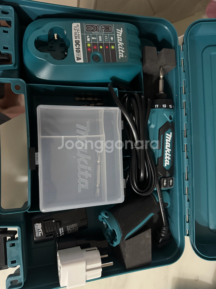 개인정보(거래정보)를 주고받는 행위는 사기에 노출될 수 있으므로 즉시 중고나라로 신고해 주세요무선 드릴과 충전기가 포함된 전동공구 세트입니다. 케이스에 깔끔하게 정리되어 있고 상태가 양호해 보여요. 목공이나 DIY 작업에 유용한 제품입니다.