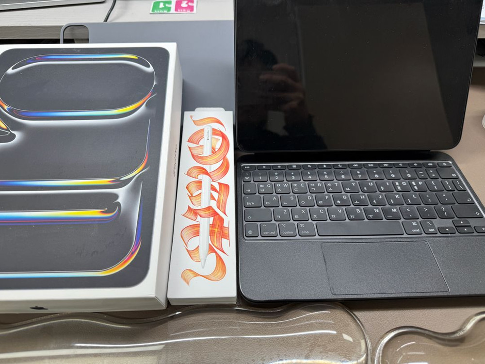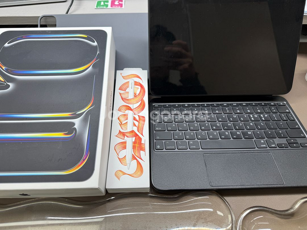 아이패드 프로11 m4/ 애플펜슬프로/매직키보드입니다 패드배터리는 91%입니다 패드는 큰 문제 없구요 키보드는 찍힘이 있습니다 그러나 애플케어가 있어서 쓰시다가 3만원 주고 새거로 교체하셔도 됩니다 아이패드는 보호 필름 붙여져 있습니다 애플케어 26년9월까지입니다