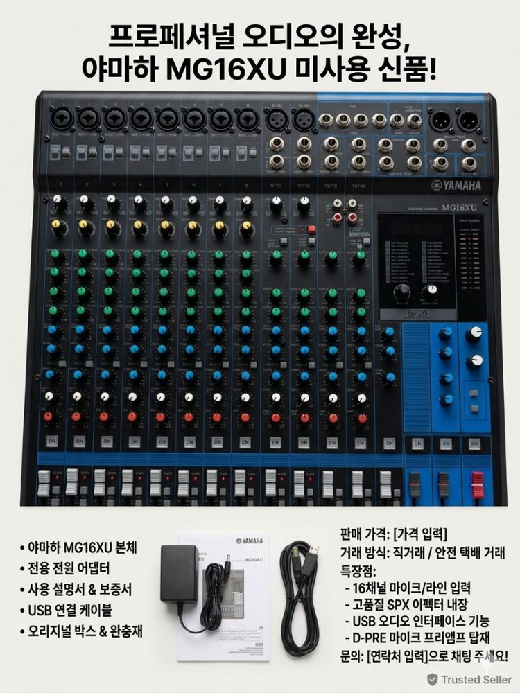 [미사용 새제품] 야마하 MG16XU 믹싱 콘솔 판매합니다 (박스풀) "단순 개봉만 한 신품급 컨디션! 야마하 정품 MG16XU를 저렴하게 가져가세요." 교회, 공연장, 홈레코딩의 표준인 YAMAHA MG16XU 모델입니다. 구입 후 바쁜 일정으로 박스에 보관만 하다가, 뒤늦게 개봉해보니 이미 반품 시기를 놓쳐버려 눈물을 머금고 중고 장터에 내놓습니다. ✨ 제품 상세 정보 • 모델명: YAMAHA MG16XU (16채널 믹싱 콘솔) • 상태: 미사용 새제품 (단순 개봉) • 박스 구성품(전원 케이블, 매뉴얼, 랙 마운트 키트 등) 모두 그대로 있는 풀박스 상태입니다. • 비닐도 채 벗기지 않은 새것과 다름없는 컨디션입니다. • 특징: * 고품질 D-PRE 마이크 프리앰프 탑재 • 24가지 SPX 고품질 이펙터 내장 • USB 오디오 인터페이스 기능 지원 ⚠️ 판매 사유 몇 개월 전 구매 후 보관만 하다가 최근에야 박스를 열었습니다. 변심으로 인한 반품을 하려 했으나 기간이 지나버려 판매하게 되었습니다. 기기 자체는 전원 한 번 넣어보지 않은 무결점 새제품입니다.