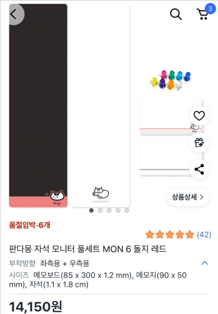 판다몽 자석 모니터 메모보드 MON 6 돌지 레드 색상 판매합니다. 제가 좌측 메모 보드를 사용하여 이를 제외한 우측 메모보드 및 기타 구성품 모두 새상품으로 판매합니다. - 사이즈: 메모보드 (85 x 300 x 1.2 mm), 메모지 (90 x 50 mm), 자석 (1.1 x 1.8 cm) - 모니터 옆에 부착하여 메모를 편리하게 관리 할 수 있습니다. - 자석으로 되어 있어 귀여운 자석 및 마그넷 부착도 가능합니다!