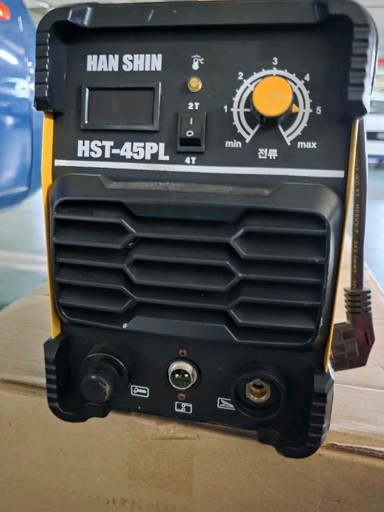 한신 LASTON HST-45PL 플라즈마 절단기입니다 AC 220V, 60Hz 제품입니다 실사용은 10회 미만입니다. 사진으로는 안보이는데 토치,어스 케이블. 모두 포함입니다. - 플라즈마 절단기로 다양한 작업 가능 - 튼튼한 내구성으로 오래 사용 가능 전반적으로 사용감 있습니다 사진 그대로 입니다. 한신(HAN SHIN)의 HST-45PL 플라즈마 절단기입니다. 🛠️ 주요 사양 용도: 철, 스텐, 알루미늄 등 금속 절단. 절단 능력: 최대 10~15T(mm) 두께까지 절단 가능. 전원: 단상 220V. 무게: 약 6.6kg으로 가볍고 콤팩트하여 이동이 편리함. ⚙️ 패널 구성 및 기능 전류 조절 노브: '전류'라고 적힌 노란색 다이얼로 절단 세기를 조절합니다. 2T/4T 스위치: 토치 스위치 작동 방식을 선택합니다. 2T: 스위치를 누르고 있는 동안에만 작동합니다. 4T: 한 번 누르면 연속 작업이 가능하고, 다시 누르면 멈춥니다 (장시간 작업 시 유용). 전면 포트: 왼쪽부터 토치 연결구, 제어선 연결구, 어스(Ground)선 연결구 순으로 배치되어 있습니다.