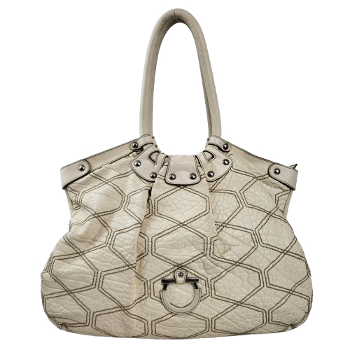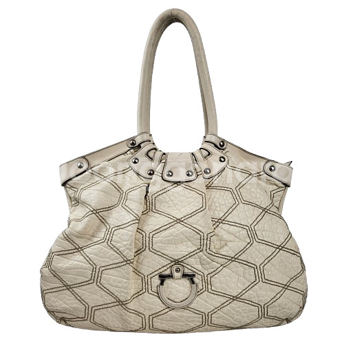 정품 페라가모 간치니 페블가죽 스티치 숄더백 입니다. 아이보리베이지 컬러의 페블가공 처리한 천연가죽으로 만들어진 제품이에요. 전면 페라가모의 시그니처 간치니 장식과 바디 전체 육각모양 스티치로 포인트를 준 예쁜 가방입니다. 넉넉한 사이즈로 수납공간도 좋아요. 사용감 있으며 특별한 데미지는 없습니다. 착한가격에 명품 페라가모 간치니 숄더백 얼른 데려가세요! 사이즈 : 가로 45 세로 30 바닥폭 6 cm