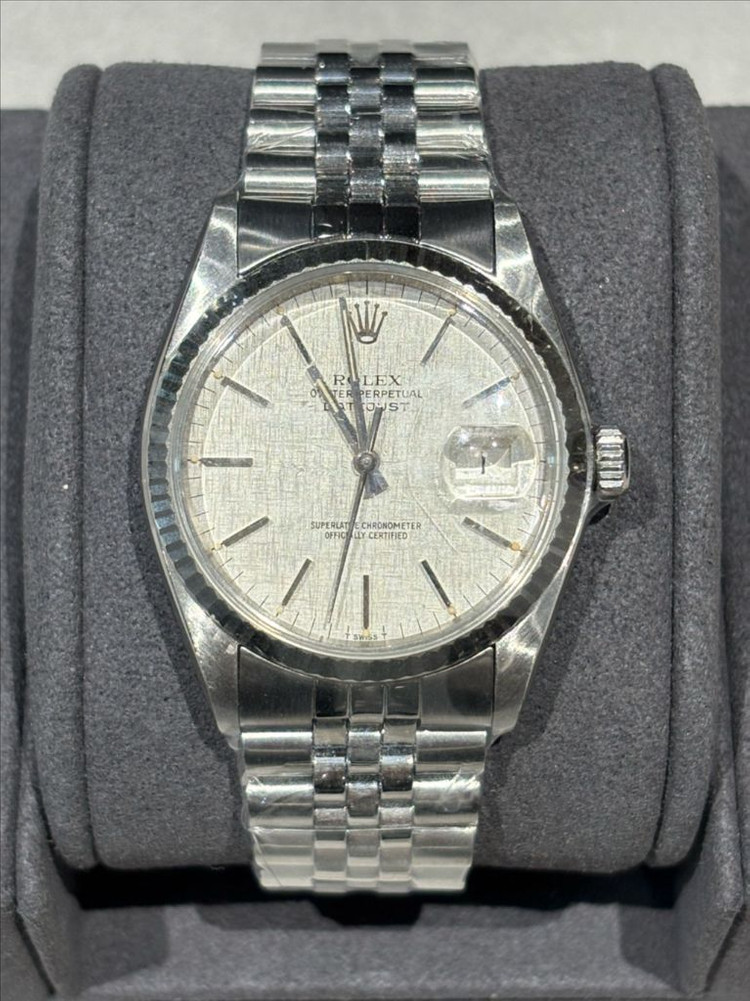 중고 롤렉스 데이트저스트 36 스틸 실버 보카시 바 16014 - 5 단위 * 5 단위 : 1978년대 생산된 모델입니다. 36 mm 스틸 쥬빌리, 보카시 다이얼, 바 인덱스 브랜드 보증서, 정품 박스 없습니다. 폴리싱 한 상품이고 마디 갯수는 새 상품 기준 2개 없습니다. 빈티지 상품 특성 상 다이얼, 핸즈, 인덱스 변색 있고 유리 기스 있습니다. 밴드도 살짝 늘어짐 있습니다. 서울, 부산 직거래 하고 외 지역도 가능합니다.