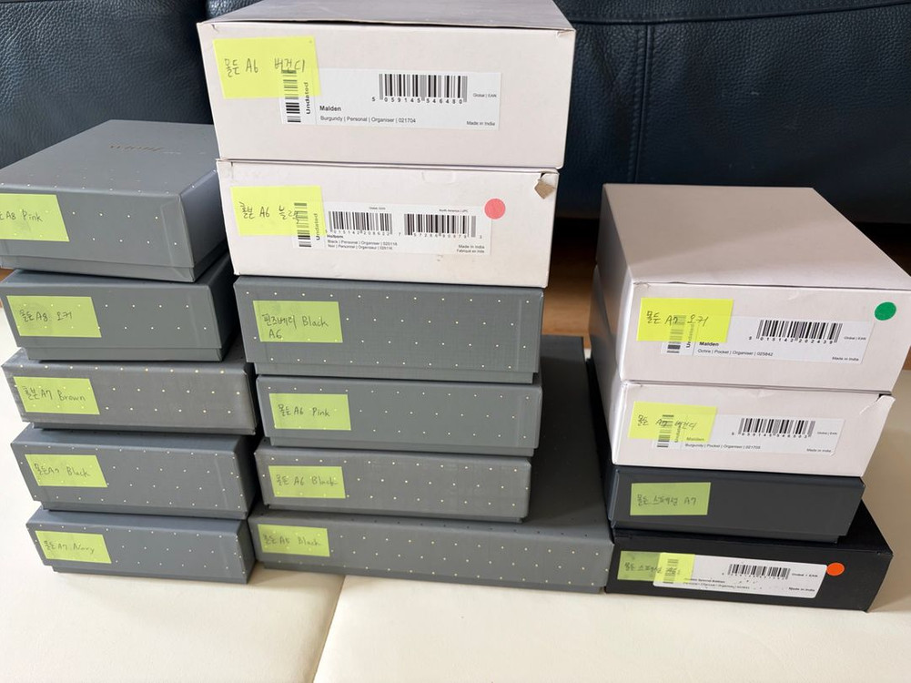 안녕하세요 파일로팩스 다이어리 종류별로 사이즈별로 색깔별로 수집했습니다~ 몰든 홀본 핀즈베리 등등등, 포스트잇에 적어놓았습니다^^ - 홀본a7 a6 - 몰든 블랙 a6 a7 - 몰든 오커 a7 a8 판매완료 수집 기간은 5~3개월 전쯤 최근 구매이구요 오래 묵은것들 아닙니당! 네이버 스토어 혹은 타스크오피치나에서 직접구매했습니다~ 전부다 새상품 혹은 잠깐씩 구경만해본 풀 구성품들 입니다 간혹 몇장 사용했던 건 문의주시면 말씀 드릴게요~~~ 가격은 정가에서 -50,000원씩 빼드리고 단종된 구하기 힘든 것들은 정가 그대로 받습니다 :) 네고는 어려울 것 같구요 두개이상씩 구매해주시면 고려해보겠습니다! 제 스스로도 가죽제품특성상 만족한 컨디션이있고, 불만족스러웠던 것들도 있긴 하지만 나름 최선다해 양품구매했습니다! 문의 얼마든지 주세요 :) 아이 키우고있어서 빠른 소통 노력은 해볼게요 ㅠㅠ~~~ 쿨거 부탁드려요 택배비 일반 +4,500 반택 +2,000